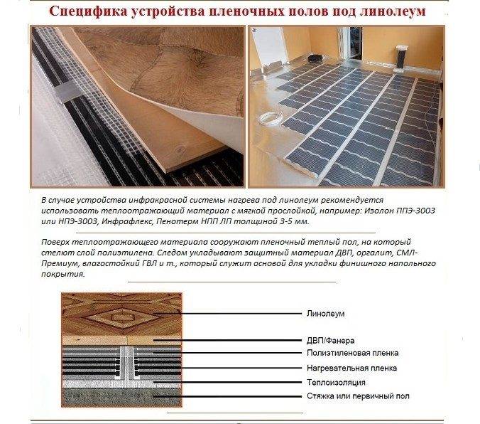 Инфракрасная пленка быстро и равномерно прогревает поверхность пола. Особенности вышеупомянутых покрытий — их нельзя перегревать выше температуры 24-27 градусов С. Уточнить пороговое значение температуры эксплуатации можно у продавцов напольных покрытий. При превышении этих температур начинаются химические и геометрические изменения.У ламината изменяется ширина швов, его может начать пучить. Линолеум может изменить цвет, и начать выделять продукты химического разложения.