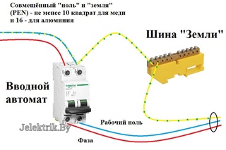 В пределах одной групповой линии, допускается объединение проводников PE (защитное заземление) и N (рабочий нуль).При этом после разделения ввода PEN на шины PE и N, конечные потребители подключаются на разные шины.Важно! Использование одной шины для подключения рабочего нуля и заземления, запрещено! Это принципиальный вопрос, необходимо понимать разницу между разделением и объединением PE и N.С момента разделения, линии заземления и нуля могут быть проложены в одном силовом кабеле, но проводники должны быть изолированы.