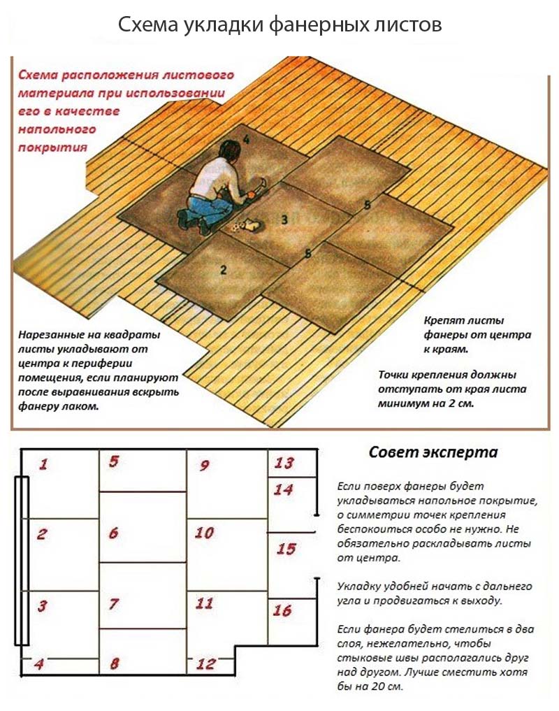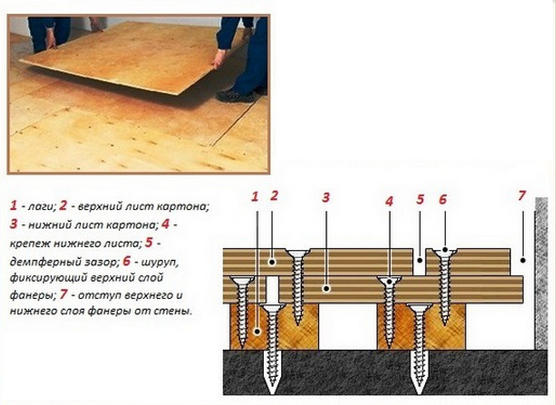 Закрепляйте лист фанеры длинными саморезами, которые уйдут глубоко в лагу. Соблюдайте шаг в 10-15 см.
