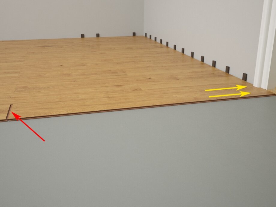 Далее подкладываем распорные клинья или обрезки ламината под первый ряд.