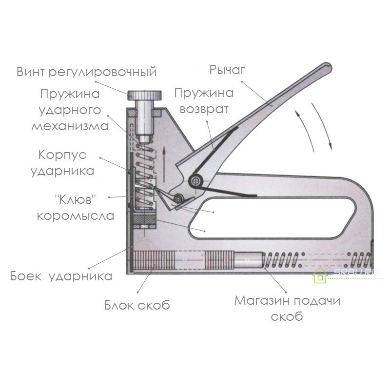Именно от него зависит надежность работы устройства. Во многих моделях этот элемент выполнен в виде бегунка, прижимающего магазин, который прочно зафиксирован в верхней части устройства при помощи пружины. В мощных моделях вместо пружины используется стальная пластина, что позволяет степлеру служить дольше. В случае выхода из строя пружины вместо неё можно использовать пластиковую ленту, хотя она не отличается долговечностью и используется преимущественно в дешевых версиях.