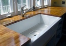 Пока в эксплуатации мне нравится. Но мы ее используем всего несколько месяцев, сложно сказать как будет дальше — время покажет. Я стараюсь вытирать насухо после работы, особенно края, стыки. На ощупь столешница шершавая, немного непривычно. Но похоже не дерево, а в уходе намного проще.