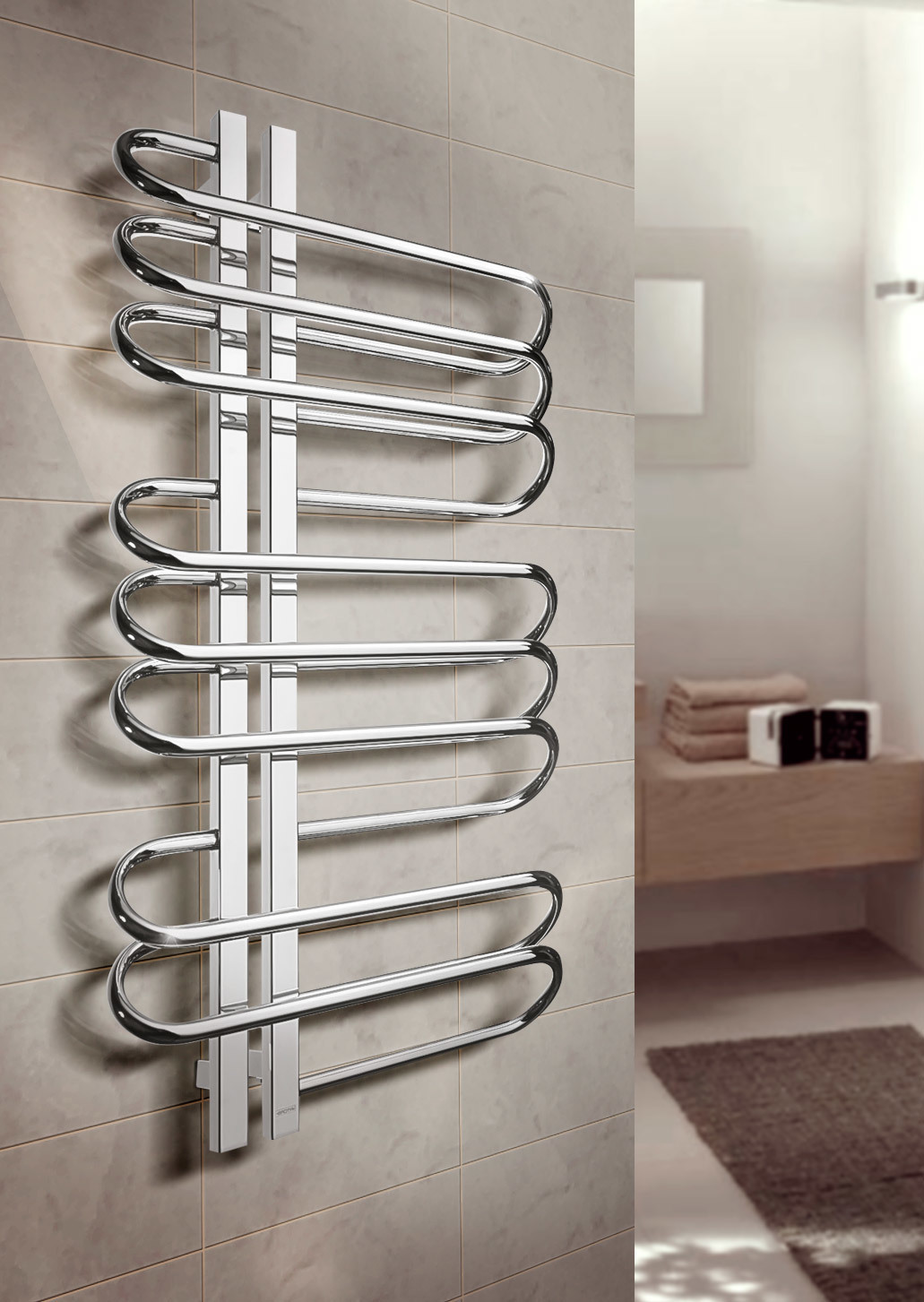 Воплощает гармонию эко-минимализма, лаконичность геометрии подчеркивают прямые трубки-поперечины, разбитые по зональному принципу. Впрочем, отвергнув гнутые профили ради прямолинейных, дизайнеры снизили эффективность одновременной сушки нескольких полотенец.
