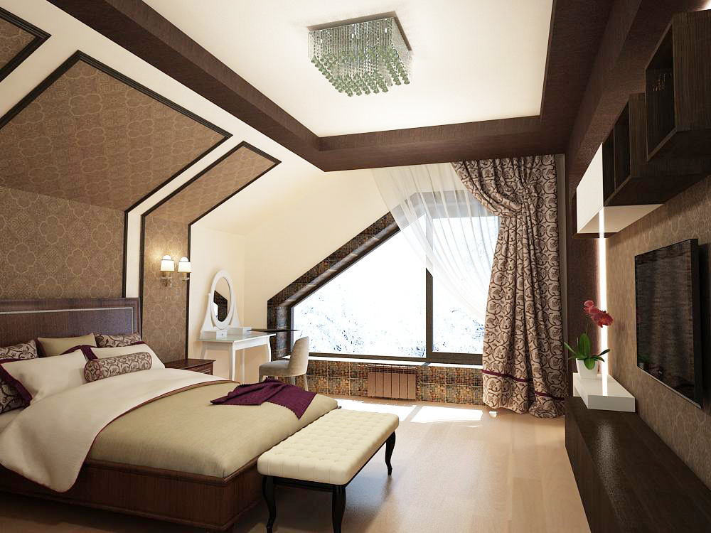 - Высокий потолок на мансарде, можно оформить более объемными или фигурными конструкциями, например из гипсокартона.