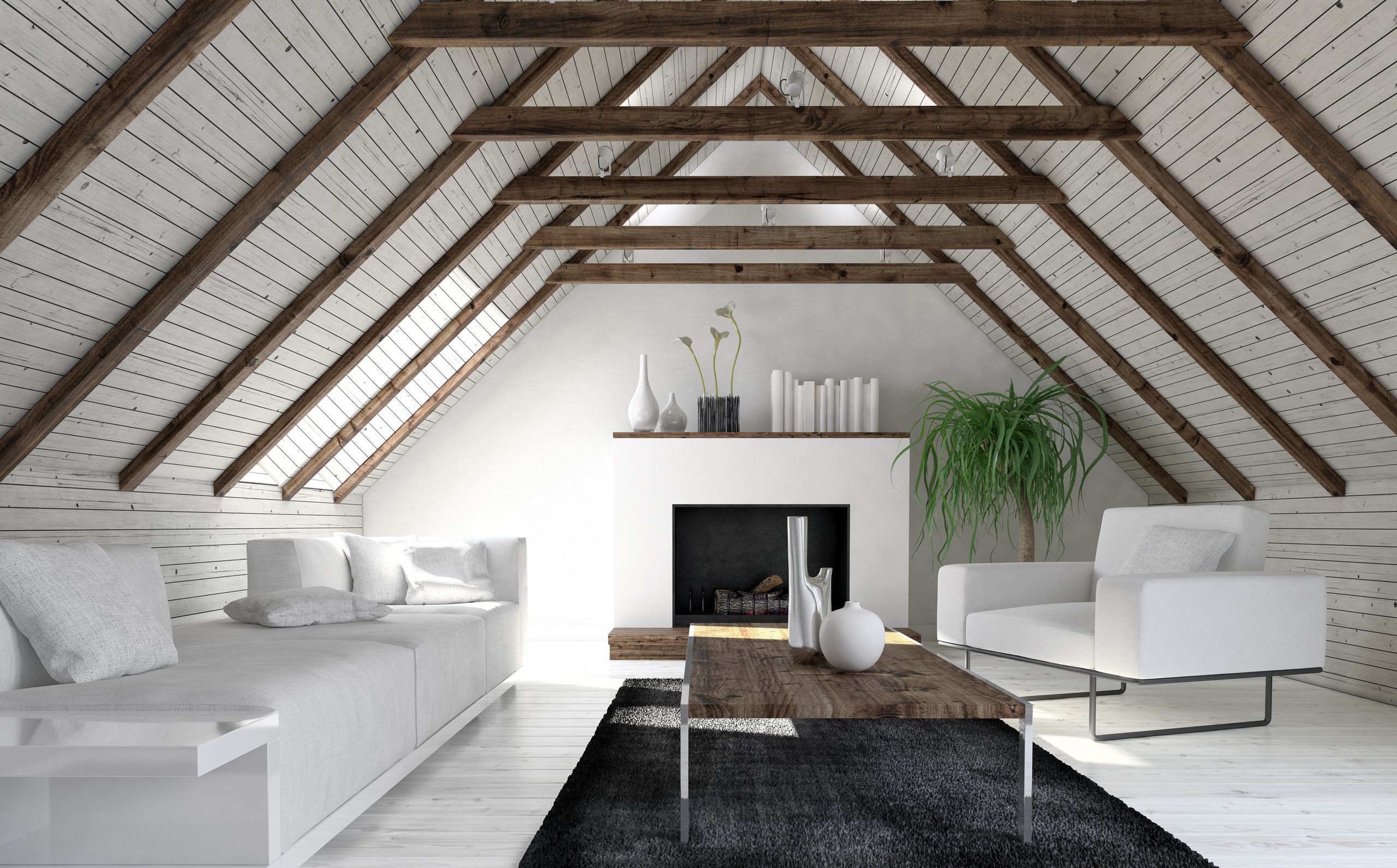 Белоснежный потолок мансарды, декорированный прямыми темными балками, создаст контраст и акцент в помещении и будет прекрасно соответствовать дизайну минималистичного сдержанного стиля.