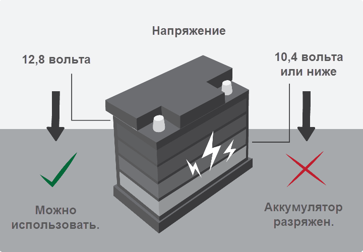 Во время теста напряжение должно оставаться выше 10 вольт. Обычно допустимое минимальное напряжение составляет 9,6 при температуре от 70 ° до 80 ° F. Если напряжение остается выше 10,0 при полной токовой нагрузке в течение 15 секунд, аккумулятор в порядке. Если напряжение упадет ниже 9,6 или если указанный ток не может быть применен, аккумулятор можно протестировать дополнительно, хотя обычно на этом этапе делается вывод о том, что он заслужил почетную отставку.Если напряжение аккумулятора находится в диапазоне от 9,6 до 10,0, зарядите его и повторно проверьте, прежде чем решить его судьбу.