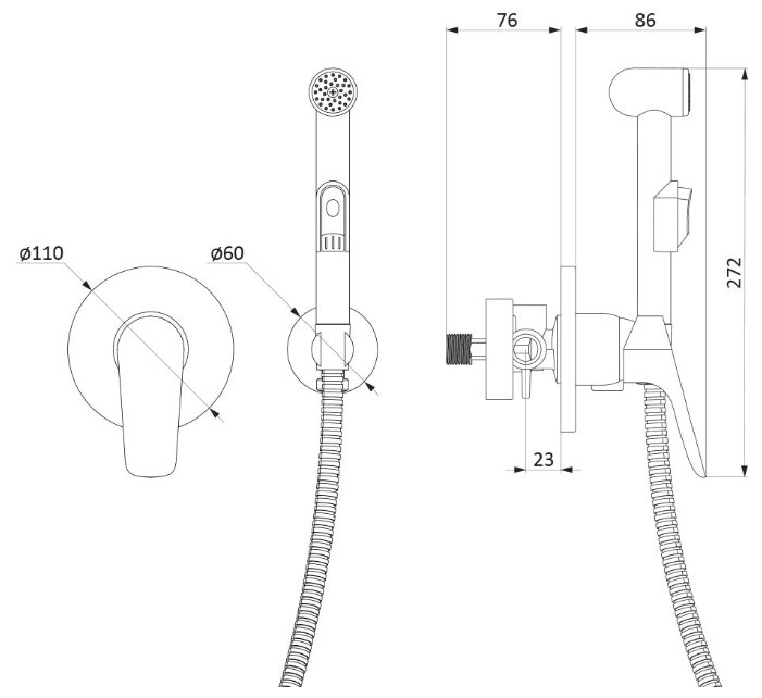 Стандарт высоты гигиенического душа от пола — 700-800 мм. Можно выбрать любое другое значение, которое будет удобным для владельца. Сделать это нужно так, чтобы подающая воду трубка не прикасалась к полу, когда лейка закреплена в держателе. Не рекомендуется ставить кронштейн над унитазом, это особенно актуально, если в комнате тесно. Так об него постоянно будут задевать локтем. Лучше устанавливать элементы на стенку перед сантехникой.