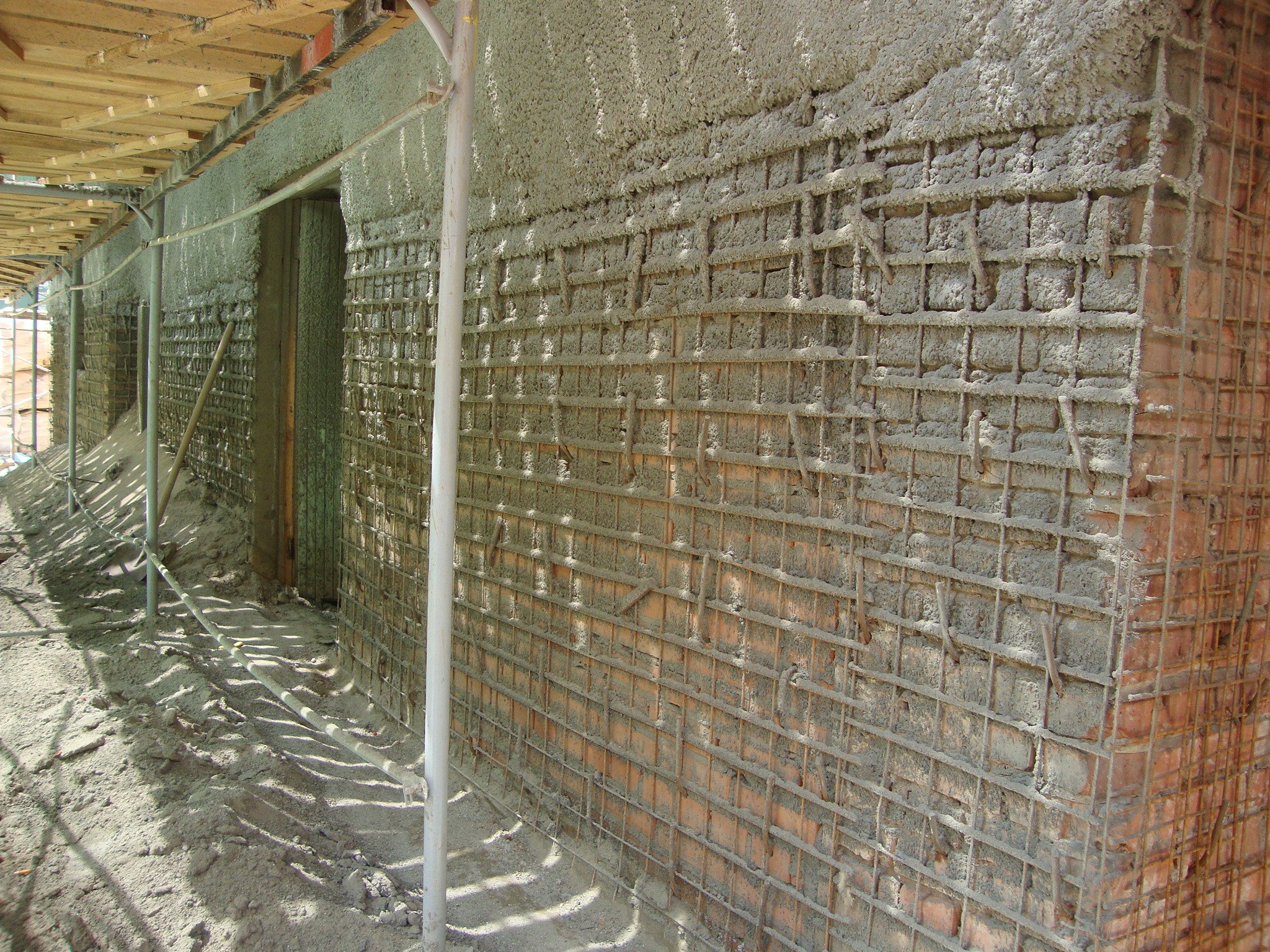 Кроме ремонта фундамента, для старых домов, построенных из рыхлых шлакобетонных блоков, рекомендован ремонт стен способом устройства нескольких монолитных армированных поясов по периметру дома с последующим оштукатуриванием по металлической сетке. Армирование может быть напряжённым и обычным. Напряжёное армирование применяется в тех случаях, когда необходимо не только укрепление, но и стяжка дома. При напряжённом армировании диаметр арматуры или сечение полосы выбирают большим, чем при обычном армировании. Впрочем через некоторое время простое армирование стены перейдёт само по себе в состояние напряжённого вследствии дальнейшей усадки дома.