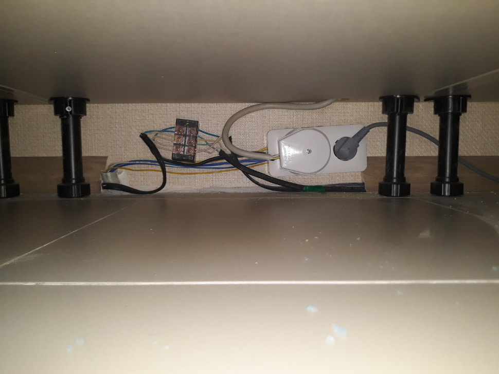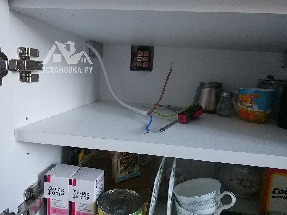 При желании скрыть коммуникации разрешается фиксировать розетку непосредственно внизу под дном нижних кухонных шкафов. При таком размещение доступ к ней осуществляется через пространство создаваемое высотой ножек тумбочек. Ее следует приподнять над полом на высоту хотя бы несколько сантиметров, чтобы в случае протечки вводы электрические контакты не намокли.