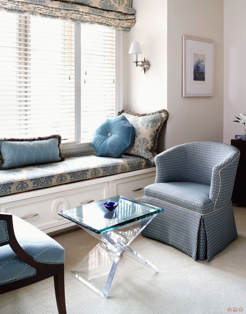 Подоконник с сиденьем вписывается практически во все дизайнерские стили интерьера. Важно только четко выдерживать общее направление, правильно выбирая материалы для лавки и ткани для обивки сиденья и пошива подушек. Практичнее делать съемные мягкие сиденья, чем капитальную обивку, так как стекла нужно периодически мыть.