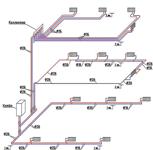 Вполне естественно, что для частного дома этот показатель редко превышает десяток установленных батарей. Если собственнику здания необходимо выполнить разводку по постройке с двумя и более этажами, то отопительная система делится на несколько контуров.