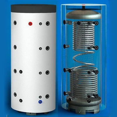 - с буферной емкостью. Оправдана при эксплуатации стиральной или посудомоечной машинки. Стоки проходят через трубку-спираль в резервуаре, а их тепло греет воду, которая выталкивается вверх. Вода возвращается в бойлер в преднагретом состоянии;
