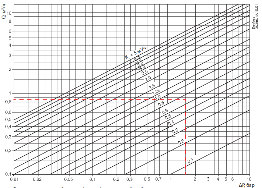 где Vо′ – общий расход в системе после отключения одного термостатического клапана, м3/ч, Vp′ – расход теплоносителя через радиатор, в данном случае он будет равен общему расходу; м3/ч.