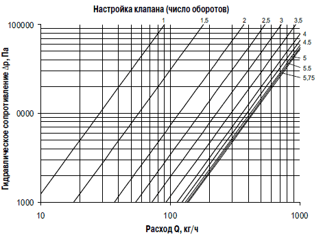 Отсюда можно сделать вывод, что в системе отопления при самых неблагоприятных условиях, когда все отопительные приборы, кроме одного, на участке перекрыты, перепад давления на термостатическом клапане может вырасти до располагаемого напора. В приведенном примере при располагаемом напоре 100 кПа расход увеличится в три раза, при этом мощность прибора возрастёт всего на 17 %.