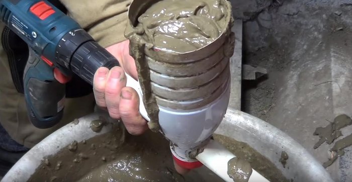 Дрель крутит шнек и бетон хорошо выдавливается через небольшое отверстие в носике.
