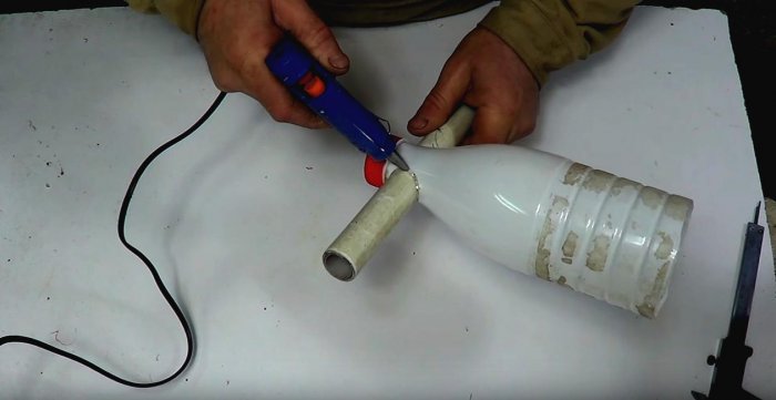 Место соединения трубы с бутылкой проклеиваем горячим клеем с обоих сторон.