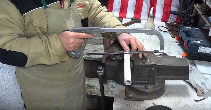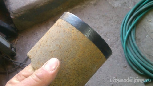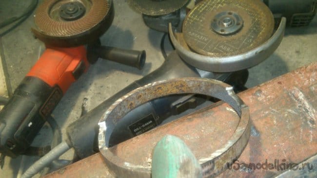 Выпиливаем полукруглое отверстие ножовкой. Все острые грани трубы стачиваем на наждаке.
