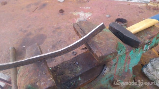 Кажется, я обрезал полки в каких-то уголках… Вот, и они пригодились. Так как металл в них мягкий, я попробовал выгнуть их при помощи молотка, расположив между широко разведёнными губками тисков: