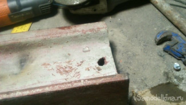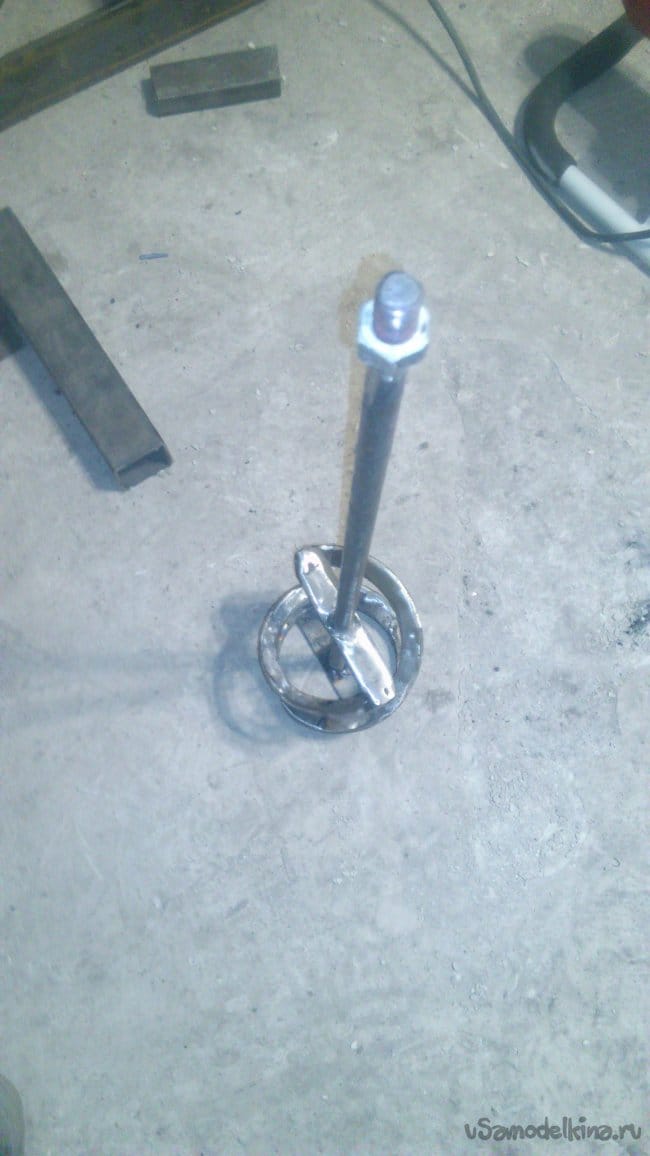 Как уже писал, заняло у меня её изготовление полтора часа, не особо торопясь. Конечно, возможно, проще купить готовую. Но, вот, я тоже так считал, но, столкнувшись на практике, получилось наоборот. Конечно же, не у всех есть такие шпильки… (но можно тогда приварить болт к куску арматуры), ни у кого, скорей всего, как у меня, не лежат вырезанные полки от уголков (….но можно распустить вдоль обрезок полосы), нет обрезков труб большого диаметра (…но тогда можно сделать и снизу так, как я сделал сверху)…
