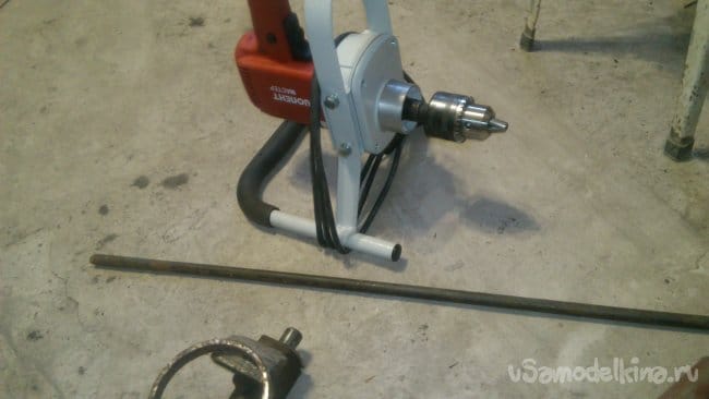 Собираем пистолет с насосом. Для этого зажимаем змеевик в дрель и вставляем в трубу.