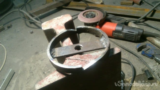 Для того, чтобы закрепить кольца на шпильке, я решил использовать стальную полосу, приваренную диаметрально поперёк кольца. Для этого я сделал в кольцах выборки, чтобы утопить полосу заподлицо: