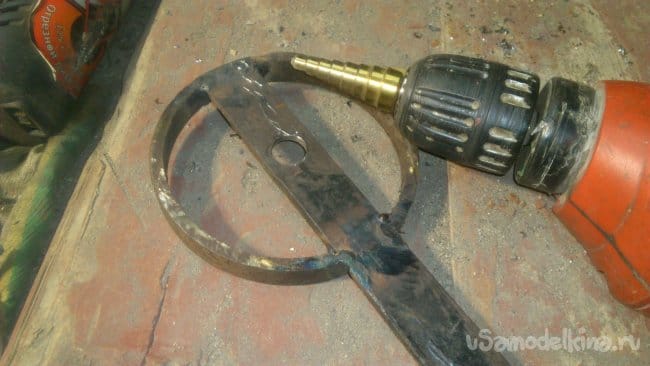 В нём есть неровно прожжённое электросваркой отверстие, в которое оказалось удобно вставить мою заготовку, и выгибать её при помощи одетого на второй конец обрезка водопроводной трубы.