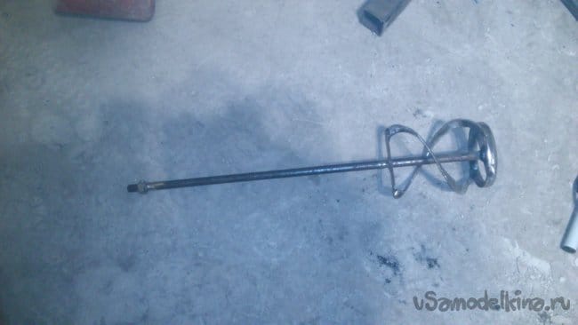 Проектирование велось по ходу дела ))). Прототипами выступали наиболее понравившиеся из виденных сегодня в магазине, конструкций. Для размешивания тяжёлого раствора лучше всего использовать «правостороннюю спираль», которая при вращении захватывает нижние слои и выталкивает наверх. Она должна обладать большой жёсткостью, поэтому, в нижней части необходимо сделать сплошное кольцо. На глаза попался остаток металлической сварной трубы, которую я использовал, изготавливая дымоход в своей отопительной печи: