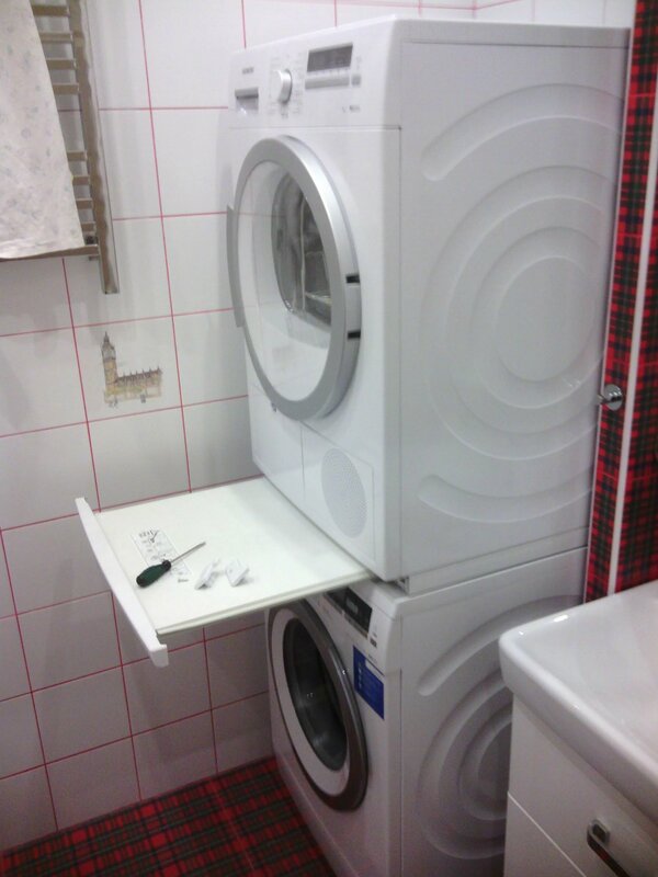 Возможность поставить сушильную машинку на стиралку оговаривается особо для каждой модели: например, в руководстве к Bosch WTG 86400 OE предлагается дополнительно приобрести соединительный элемент для монтажа стиральной и сушильной машины в колонну с выдвижной полочкой для белья или без неё. В комплект входят также саморезы и сверло с ограничением глубины сверления. Для модели Asko T208H.W.P предусмотрены ножки-присоски и противоопрокидывающее устройство.