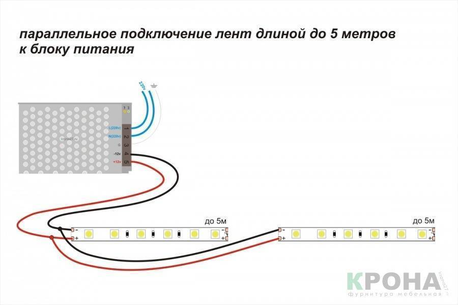 Для подключения большей длины светодиодных лент применяют параллельное соединение нескольких участков. Причем, подключать параллельно можно столько лент, сколько способен выдержать блок питания.