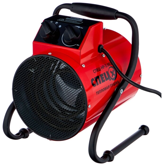 Для перемещения пушка оснащена удобной рукояткой. Снизу под корпусом закреплена металлическая подставка. - Внутри корпуса установлен электрический ТЭН, исполняющий роль нагревателя. Он выделяет тепло после подачи на него напряжения 220 или 380 вольт. Производитель использует именно трубчатые модели. Такие ТЭНы дольше служат и являются пожаробезопасными.