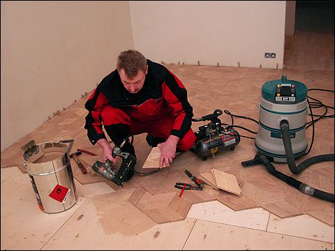 Перед тем, как класть паркет на старый пол, его разбирают в поврежденных участках, ремонтируют, шлифуют, чистят и сушат. Фанерные листы в качестве промежуточного слоя в этом случае не понадобятся, так как его роль будет играть само основание из дерева.