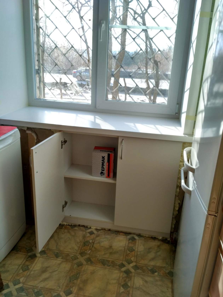 Важно: сначала нужно осуществить монтаж ПВХ окна и подоконника, и только после этого хрущевского холодильника.