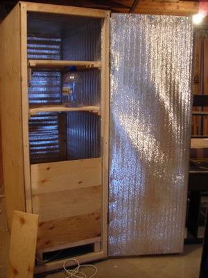 Подобную конструкцию можно сделать из старого холодильника. В этом случае задача упрощается, так как между стенками холодильника уже проложена теплоизоляция. В нижней части, которая обычно предназначена для хранения овощей, установлен терморегулятор. Строительство готово.