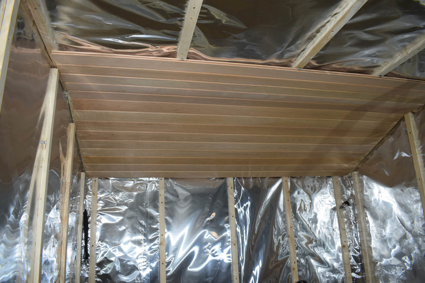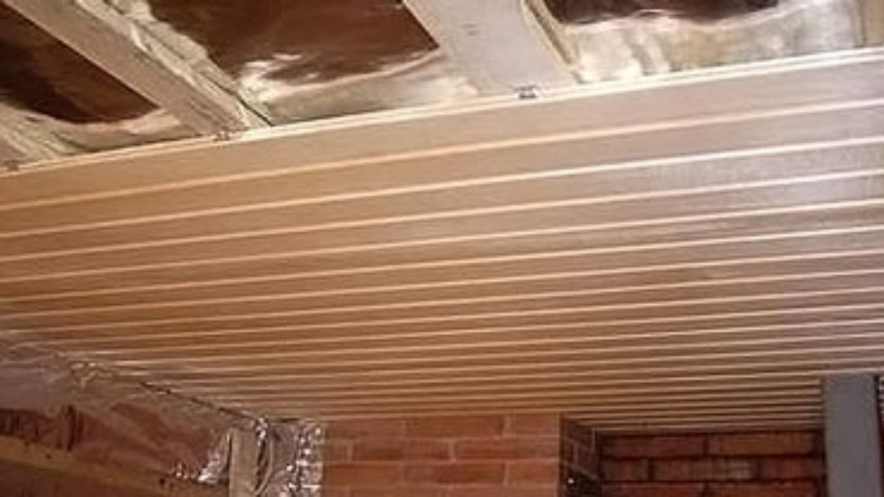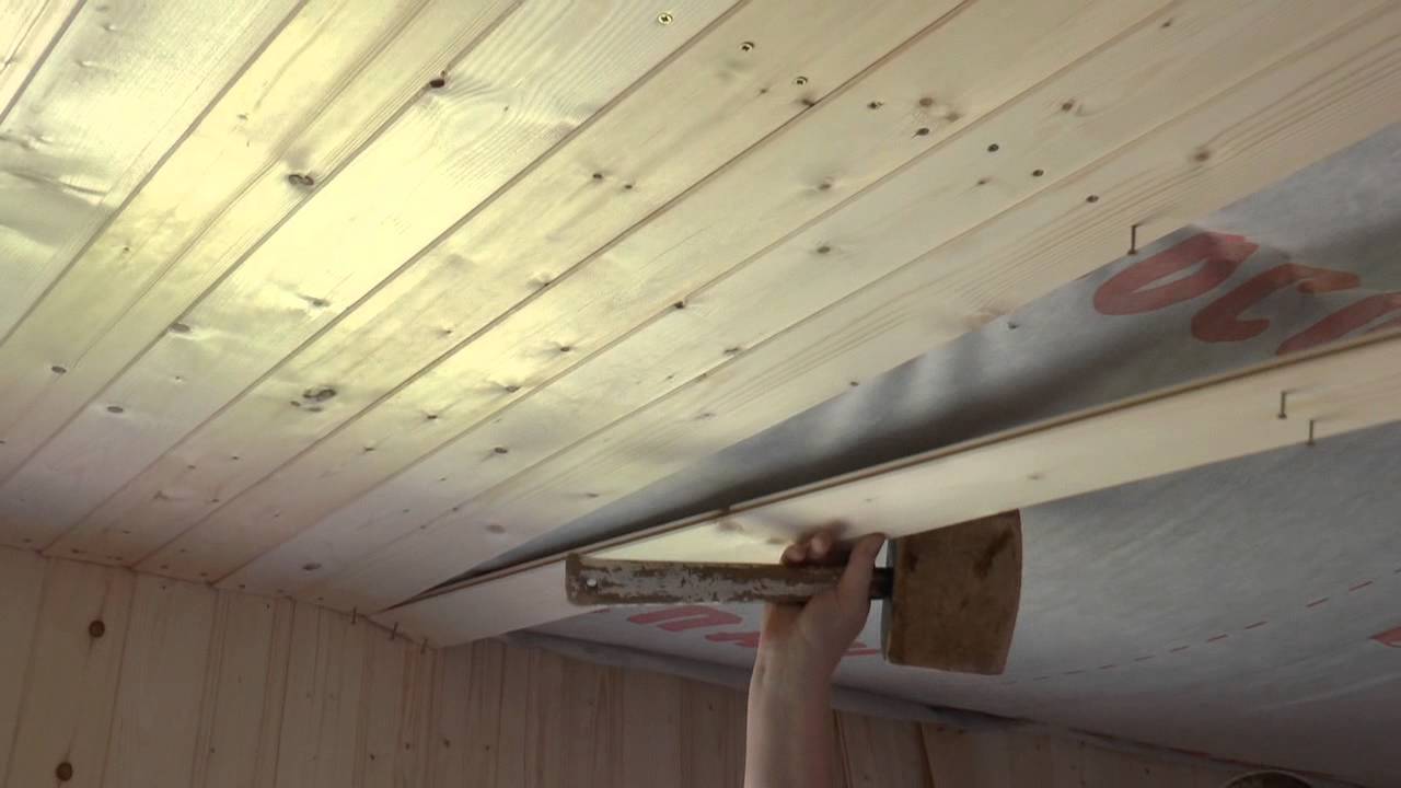Обшивка внутри дома вагонкой – крепление потолочных элементовСовет: Расстояние между рейками строго выдерживается в диапазоне должно быть от 50 до 60 сантиметров, обрешетка после установки требует обработки антисептиком.