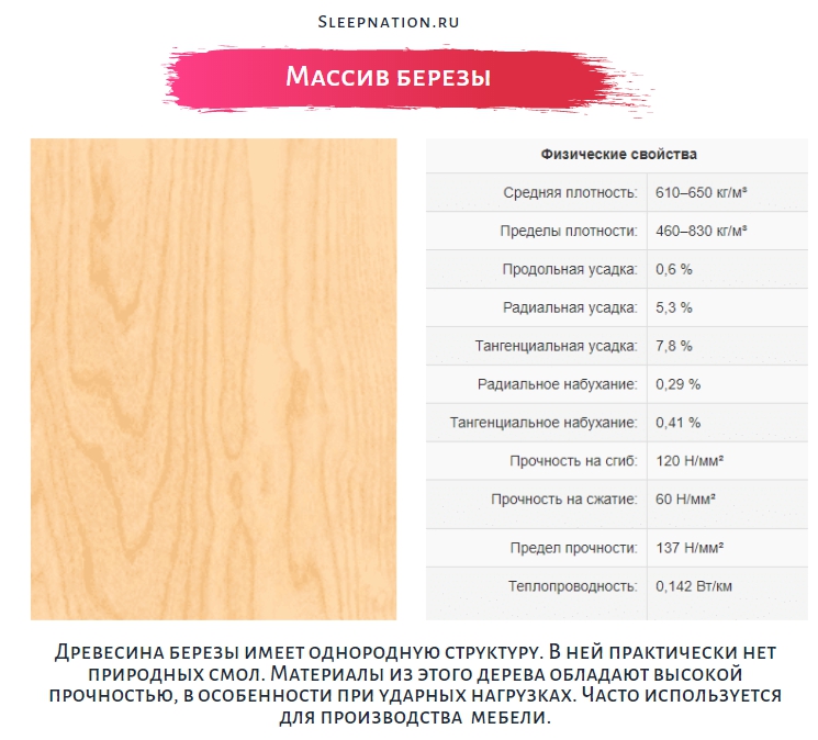 Например, массив из березы дает высокую прочность, но плохо устойчив к гниению.