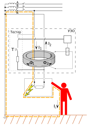 Ток утечки обычно значительно меньше тока короткого замыкания, но даже небольшой ток может быть опасен для человека. Для защиты от него используется УЗО, мгновенно разрывающее цепь (одновременно и линейный, и нейтральный проводник) при возникновении даже небольшой утечки.