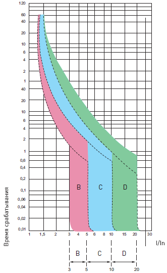 Первая срабатывает при превышении по току до 1,45 от номинала автомата. В зависимости от кратности перегрузки время, за которое автомат отключается, составляет от нескольких минут до секунд. Электромагнитная защита срабатывает при КЗ: для автоматов типа B при трёхкратном превышении номинала по току, для типа C — при пятикратном, для типа D — при десятикратном.