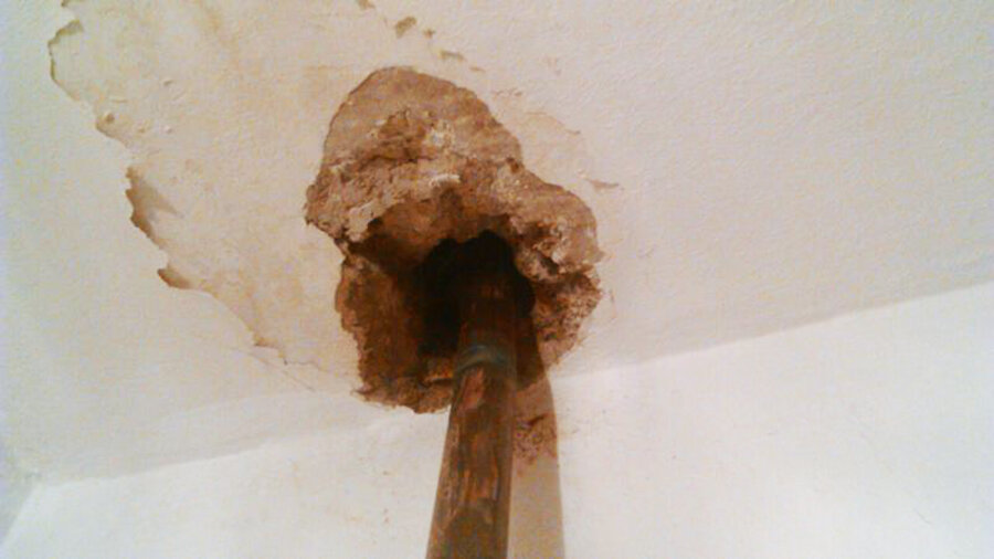 Сквозные дыры возникают в местах прохождения коммуникаций при механических воздействиях, когда глубокие трещины не ремонтируют длительное время.