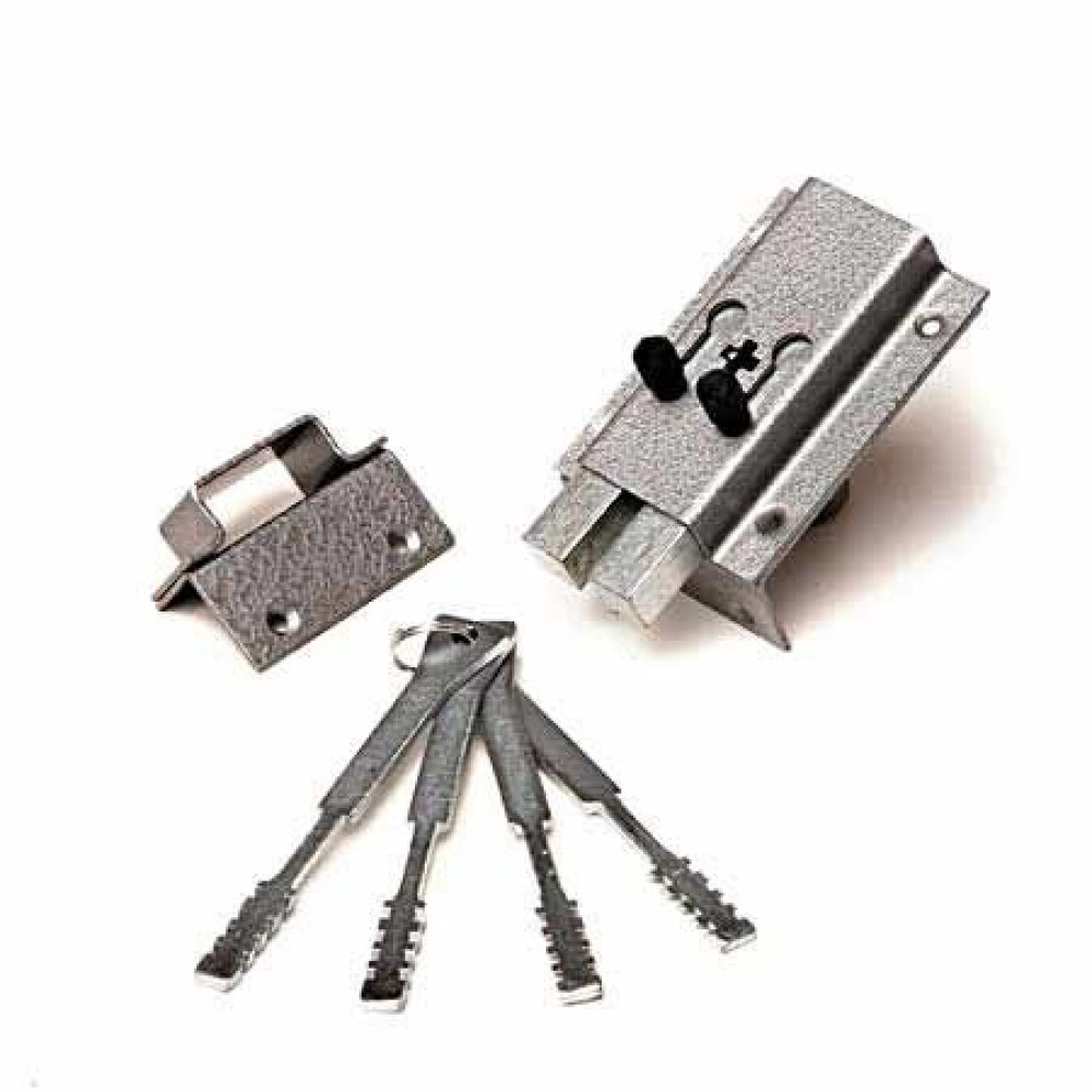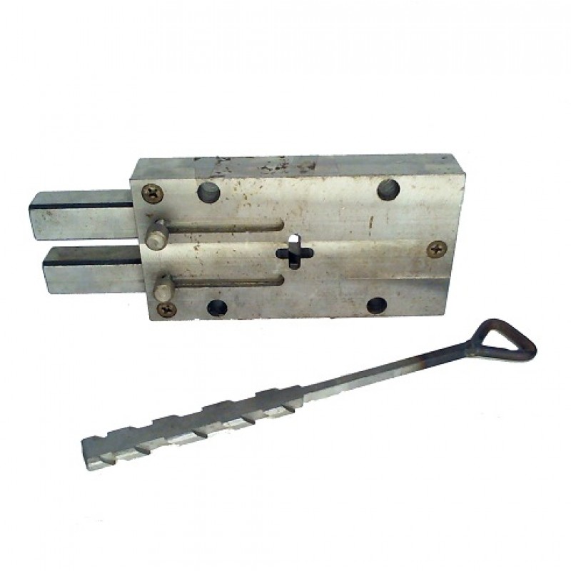 Обычно такой замок используется там, где сложно применять устройства другого типа. Кроме того, при правильной ориентации замка относительно створок, до его стержня будет сложно добраться металлорежущим инструментом или подцепить фомкой.